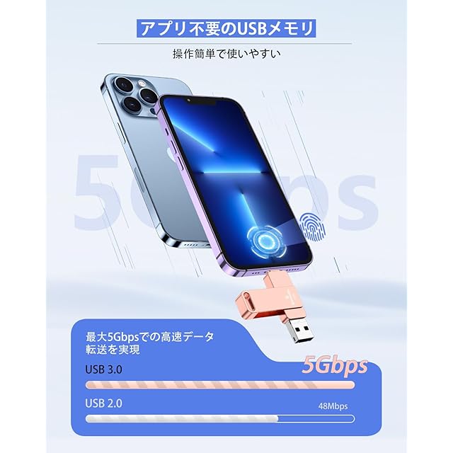 【暗号化機能・USB3.0高速転送】iphone対応usbメモリにファイル暗号化技術搭載!プライバシーデータを保護するために自分だけのパスワード/Touch IDを設定でき、ファイルをロックできます。使い心地よく、安全的なUSBフラッシュドライブ使用体験を提供いたします。未使用時はIOS端子を防塵カバーに収納できるので、ホコリや傷からも守ることができます。先端的なUSB3.0を採用して、内蔵のインテリジェントなチープを組み合わせて、データの転送速度はUSB2.0の10倍以上高速です。大量のデータをコピー&ペーストする場合でも、スピードが速いため、効率が大幅にアップします。