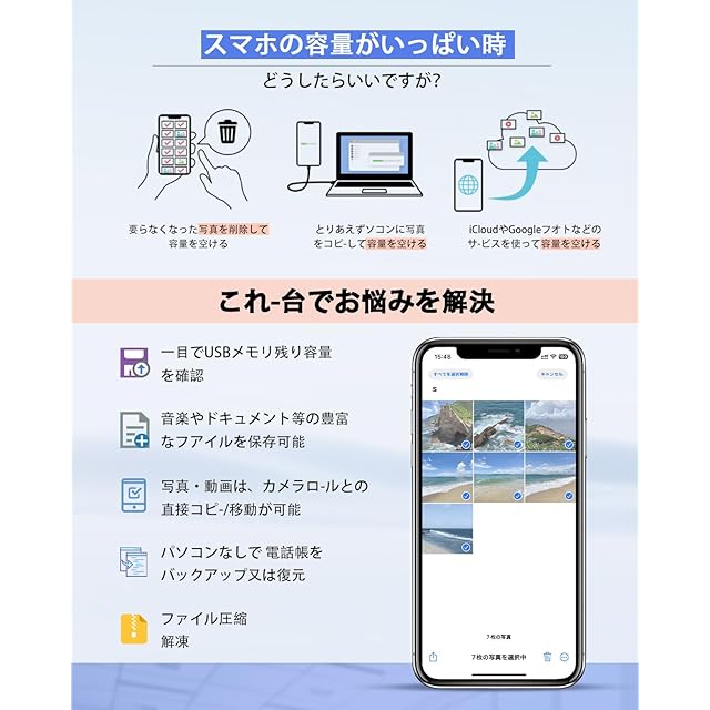 【簡単に操作・多機能実現】初心者でも簡単に利用できる多機能なデータ管理。シンプルな操作でデータをバックアップし、整理します。撮影した画像・動画データだけでなく、PDF/Excelファイルなども開いて確認できます。さらに、連絡先のバックアップおよび復元もおこなえるため、機種変更時、買い替え時などにも便利です。大容量でたくさんのデータを保存可能。インターネット環境やパソコンがない場所でも簡単にデータ容量を確保できます。