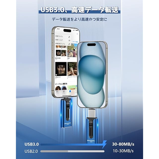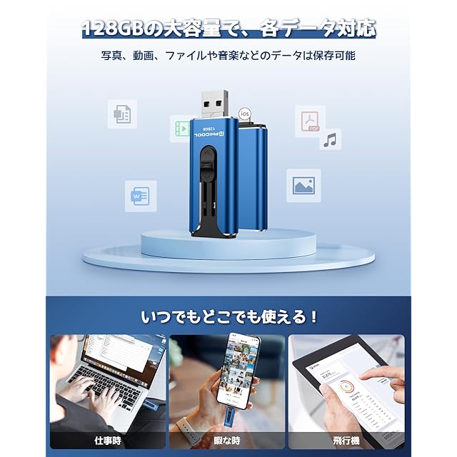 【スマホ容量不足解消・多場合に対応】スマホに保存されている動画、写真やダウンロードされているアプリが多ければ多いほど、スマホの容量はいっぱいになり、それ以上データを保存できなくなります。今はスマホのデータをクリーンアップする必要はなくて、USBメモリをそっと挿入するだけで、スマホ内のデータをUSBメモリに移して保存できます。これにより、スマホの空き容量を増やして、iCloudに課金する必要もなくなります。。USBメモリーは、日常生活で家族や友達などの写真を保存したり、仕事で各種資料を保存したり、旅行先で撮影した写真や動画を保存したり、飛行機でUSBメモリーを使って動画を視聴したりと、様々な使用シーンがあります。
