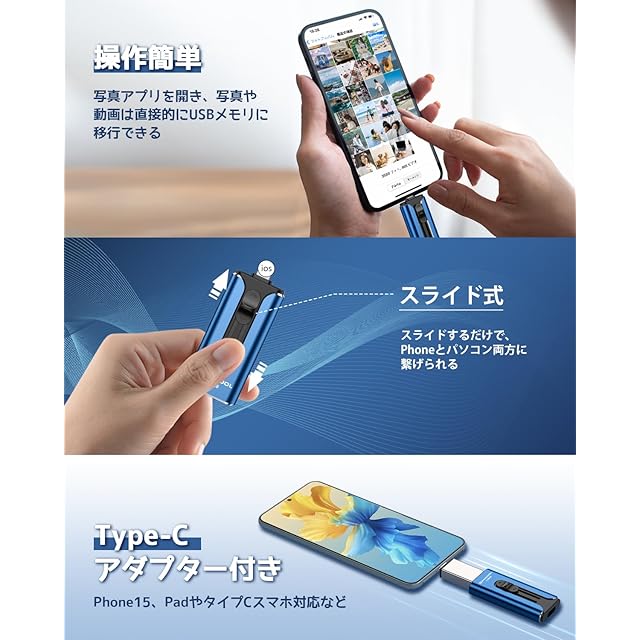 【専用アプリ不要 データ移行簡単】Phone対応 USBメモリ128GB 4in1 phone データ保存 iOS/Type-C/USB/Micro usb搭載 phone 写真バックアップライド式 タイプc usbメモリ phone 外付けストレージ Phone/Pad/PC/Macbook/Android対応 携帯容量不足解消 ブルー