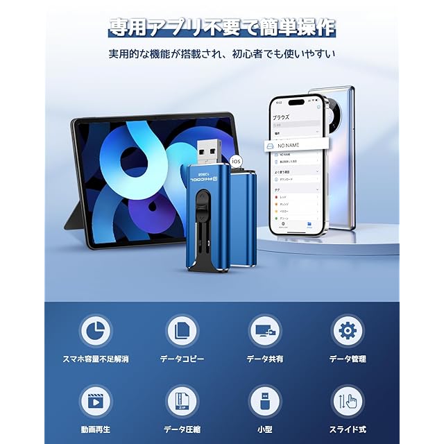 【アプリが必要なく、操作は簡単になり】まだアプリをダウンロードすることに困っていますか。今はスマホにUSBメモリをを挿入するだけで、パソコンを起動せず、専用アプリも使用せずに、スマホのデータをバックアップできます。電子機器が得意でない方も簡単に操作出来て、他の外付けストレージと比べて、多機能のUSBメモリは画期的です。
