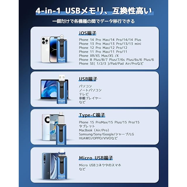 【4in1・多機能usbメモリー】USBメモリはiOS、Type-C、USB、Micro USBの四つのコネクタを搭載し、Phone、Pad、パソコンからテレビやプリンターまで、ほとんどの機種と互換性があります。USBメモリは、スマホ容量不足解消しながら、データ保存の機能も果たして、データ移行、データ管理、ファイル移動、データ共有やファイル圧縮などの機能も搭載されます。