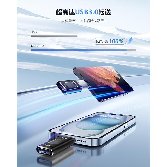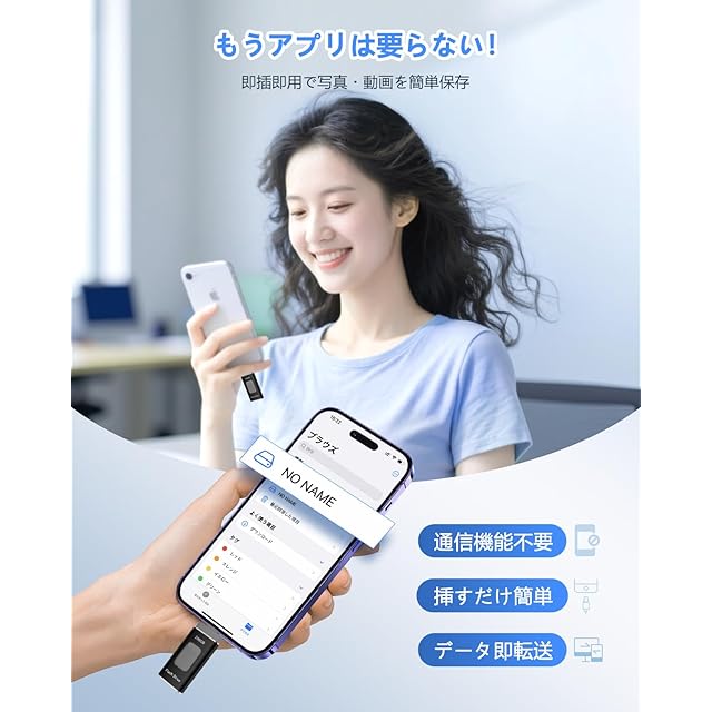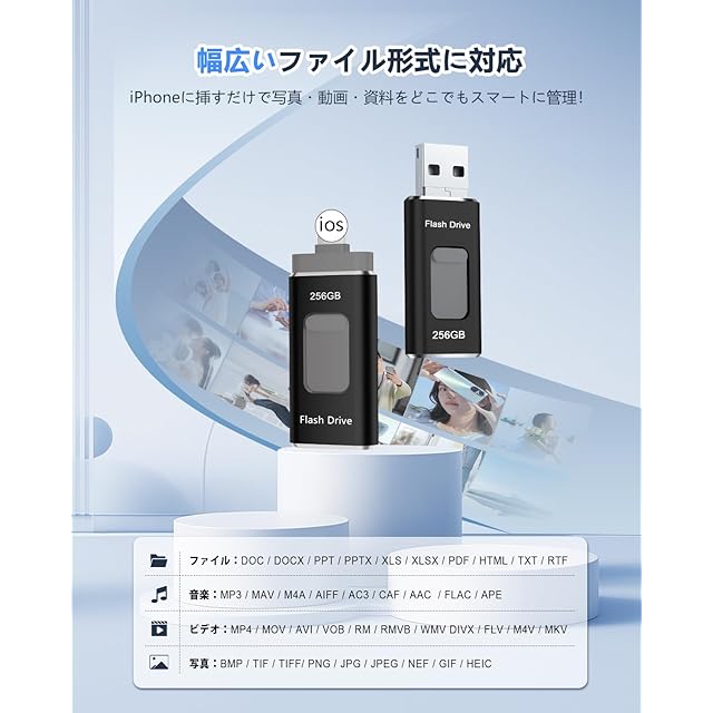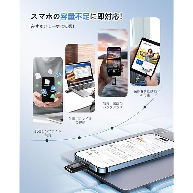 【従来品への飛躍!専用アプリ不要・多機能実現】最新技術で開発したUSBメモリでアプリなど面倒な設定は一切無し、iOS システムに付属のファイル アプリを使用して、挿せば直ぐに使用可能。写真、動画、音楽はもちろん、ExcelやPDFなどの書類データも転送可能、機器の操作が苦手な方でも簡単にデータ移動ができます。スタイリッシュなデザインに加え、便利な機能が満載のスマホ USBメモリーは、スマホと接続すると、音楽再生・写真バックアップ、ファイル圧縮・解凍、動画/画像/資料編集などの機能を果たすことができます。仕事を効率化して、日常生活をより便利にしてくれます。
