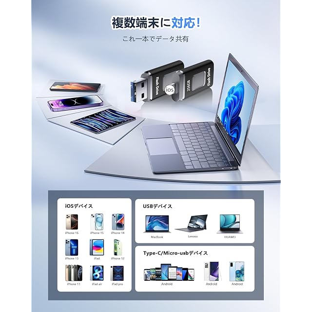 【多機種対応・互換性が抜群】アイフォンバックアップはほぼすべてのiOSシリーズと互換性があります。USB-Cコネクタを搭載したMacbook、Androidとも互換性があります。Phone 15 /15 Pro/Phone 14 /14 Pro/13 Pro Max/13 mini/ 12 /12 Pro/12 Pro Max/12 mini/ 11 /11 Pro/11 Pro Max / SE/X /XS/XS Max /XR/8 Plus/8 / 7 Plus/7 /6s Plus/6s/6 6 Plus /iPad Air iPad(第9/8/7/6/5世代)Pad mini(第6/5/4/3世代)/ MacBook Air/Macbook Pro/ iMac/PC /ノートパソコン/Androidスマホ(OTG機能付き)などのデバイスに対応します。