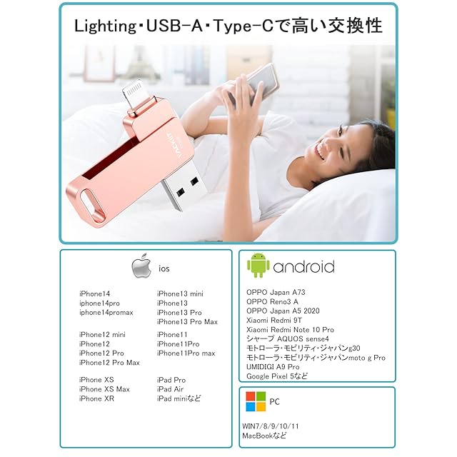 「大容量usbメモリ・幅広い交換性アイフォンusbメモリ 」128GB のiPhone USBメモリでストレージを拡張でき、iOS デバイスを容量不足から徹底的解放させます!更に、すべてのiPhoneおよびiPadシリーズと互換性があります。iPhone14/14 pro /14 Pro MaxiPhone 13 /13 Pro/13 Pro Max/13 mini/iPhone 12 /12 Pro/12 Pro Max/12 mini/ 11 /11 Pro/11 Pro Max / SE (第2/1世代) /X /XS/XS Max /XR/8 Plus/8 / 7 Plus/7 /6s Plus/6s/6 6 Plus /Pad Pro / iPod touch 6/ MacBook Air/Macbook Pro/ iMac/PC /ノートパソコンなどのデバイスに対応します。