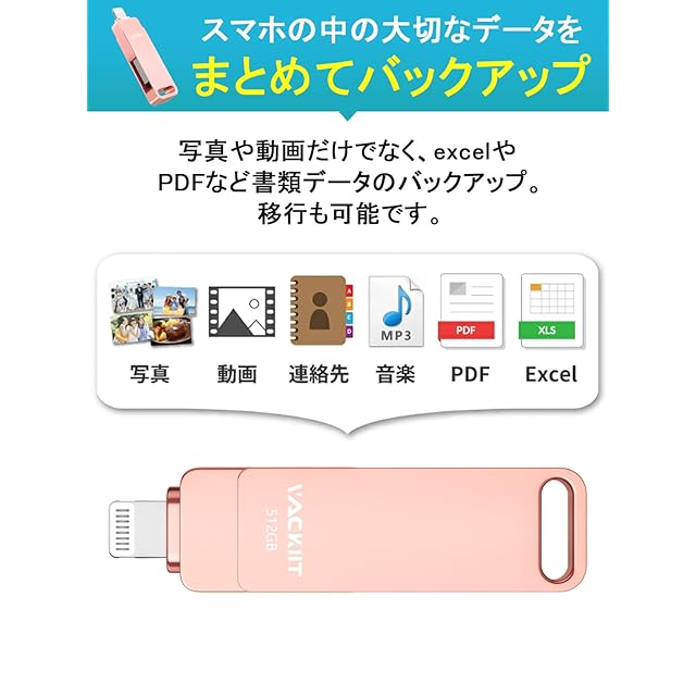 Vackiit「Apple MFi認証取得」iPhone用 usbメモリusb iphone対応 Lightning USB iPhone用 メモリー iPad用 フラッシュドライブ usbメモリ lightningコネクタ搭載 外付 容量不足解消i Phone/iPad/iPod/Win/Mac兼用(ピンク, MFI 認証済み 512GB)
