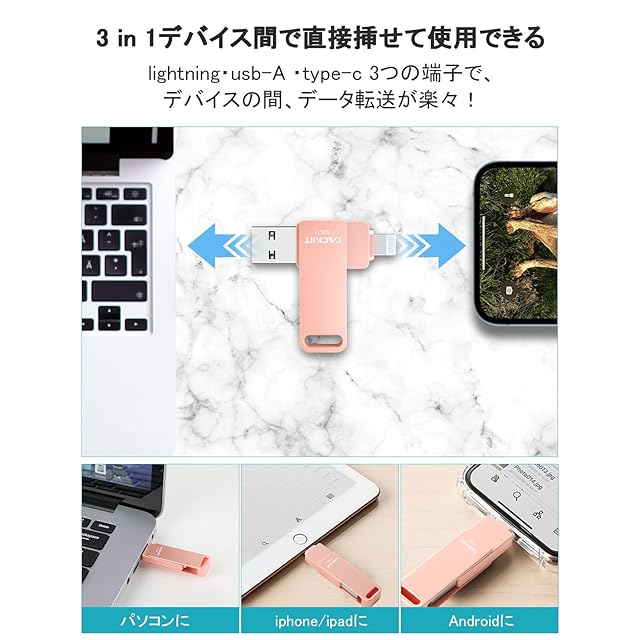 「3 IN 1 人気のランキングusb メモリiphone」当社のUSBメモリ・フラッシュドライブはlightning・usb-A ・type-c 3つの端子がつきので、iphone iPad iPod/Win Macではなく、Androidでも使用可能で、デバイスの間、データ転送が楽々!更に、当社のUSBメモリはUSB3.0対応でUSB2.0より性能アップさせ、高速なデータ転送を実現、大容量のデータや写真・ビデオも短時間で転送可能です。