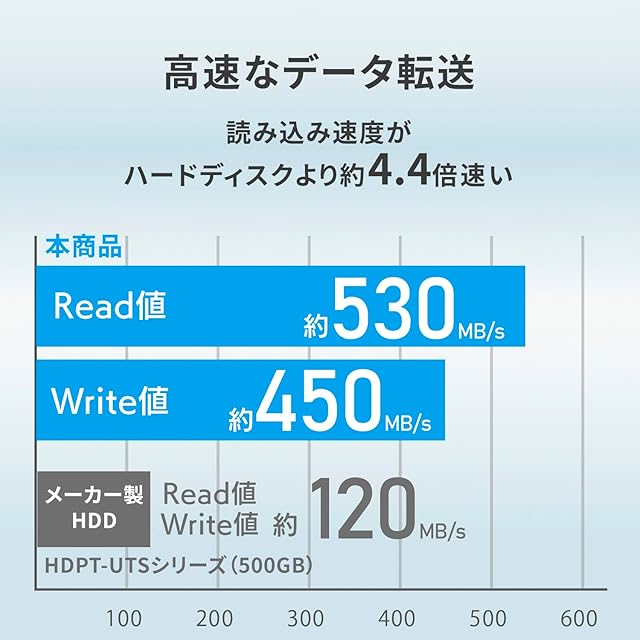 【ハードディスクより約4.4倍速い!高速なデータ転送】読み込み速度は約530MB/sと、当社製ハードディスクの約4.4倍高速!高画質の画像や動画データなど、大容量のデータもスムーズに読み込むことができます。