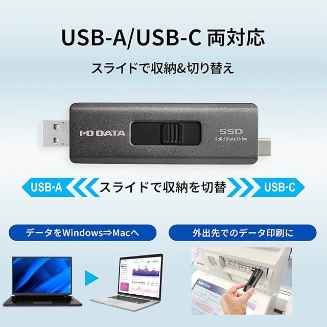 【USB-A/USB-C 両対応!】USB-AコネクターとUSB-Cコネクターを搭載しています。スライドで収納&切り替えができるため、WindowsからMacなどのデータのやり取りや、外出先でのデータ印刷にも使用でき便利です。