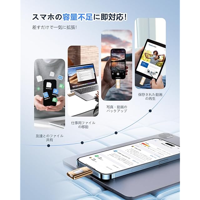 【従来品への飛躍!専用アプリ不要・多機能実現】最新技術で開発したUSBメモリでアプリなど面倒な設定は一切無し、iOS システムに付属のファイル アプリを使用して、挿せば直ぐに使用可能。写真、動画、音楽はもちろん、ExcelやPDFなどの書類データも転送可能、機器の操作が苦手な方でも簡単にデータ移動ができます。スタイリッシュなデザインに加え、便利な機能が満載のスマホ USBメモリーは、スマホと接続すると、音楽再生・写真バックアップ、ファイル圧縮・解凍、動画/画像/資料編集などの機能を果たすことができます。仕事を効率化して、日常生活をより便利にしてくれます。