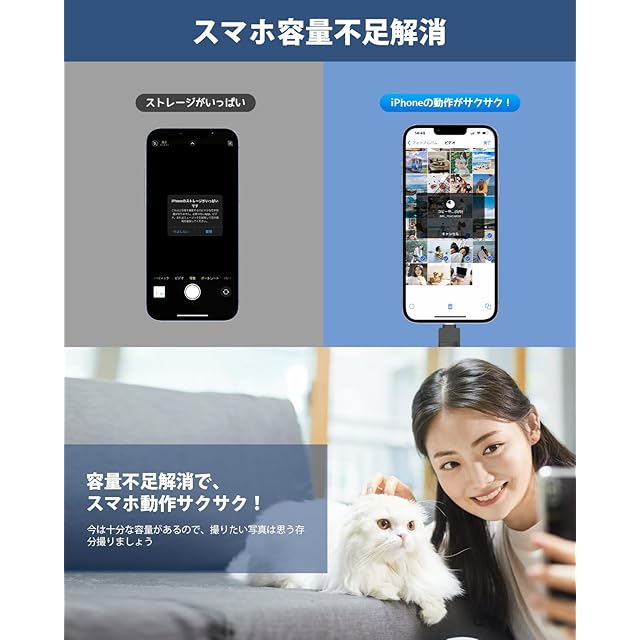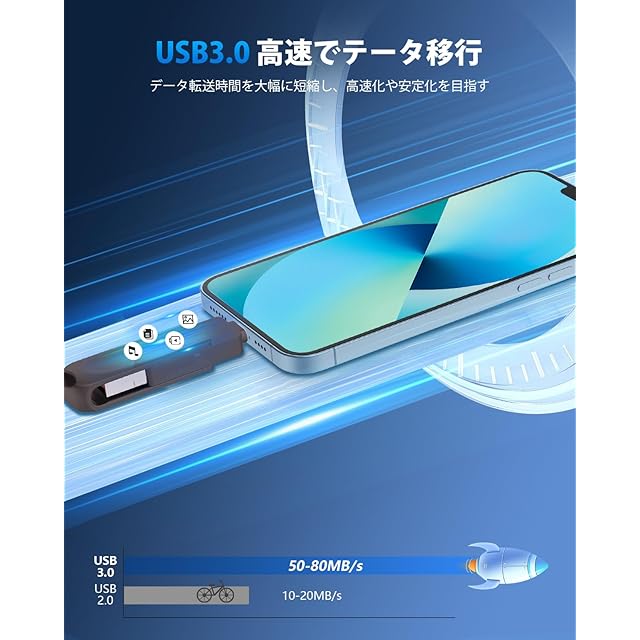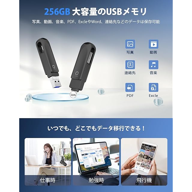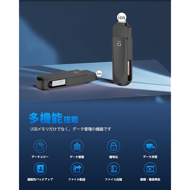 【スマホ容量不足解消・iCloud課金対策】ビッグデータの時代、スマホに保存されるデータはますます多くなり、iCloudはわずか5GBで、すぐいっぱいになり、容量が不足している問題は頻発します。今、写真、動画やファイルなどのデータはUSBメモリーにバックアップできて、iPhone対応USBメモリを使用し、容量不足の問題を簡単に解決できます。これからは、どの写真を削除するかを考える必要がなく、USBメモリを挿入し、データバックアップするだけで、スマホの空き容量を増やすことができます。iCloudにもこの以上課金する必要はなくなります。