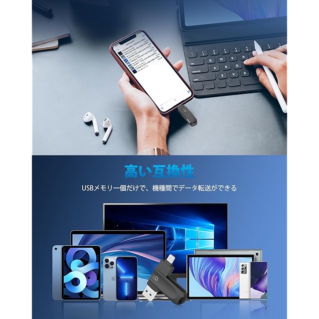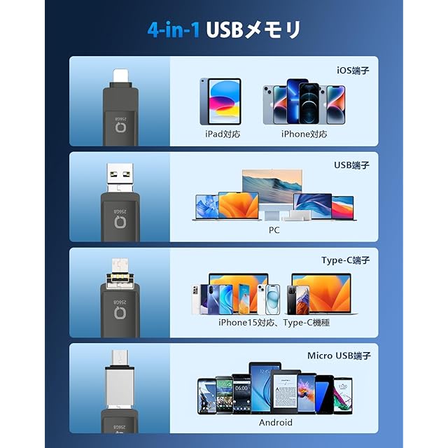 【高い互換性】本USBメモリは4つの端子があるので、ほぼすべての機種と互換性があります。iOS機種:全てのPhoneシリーズ、すべてのPadシリーズ;Android機種:Androidスマホ、Type-Cスマホ;PC:パソコン、Macbook Pro/Air、ノートパソコン(詳細は商品の説明文に書いてある対応する機種をご参考ください)。iPhone対応USBメモリは写真保存、データバックアップ、動画移行、ファイル編集や音楽再生などの機能を搭載し、iOS機種、パソコン、Android スマホの間でデータ移行は楽になります。