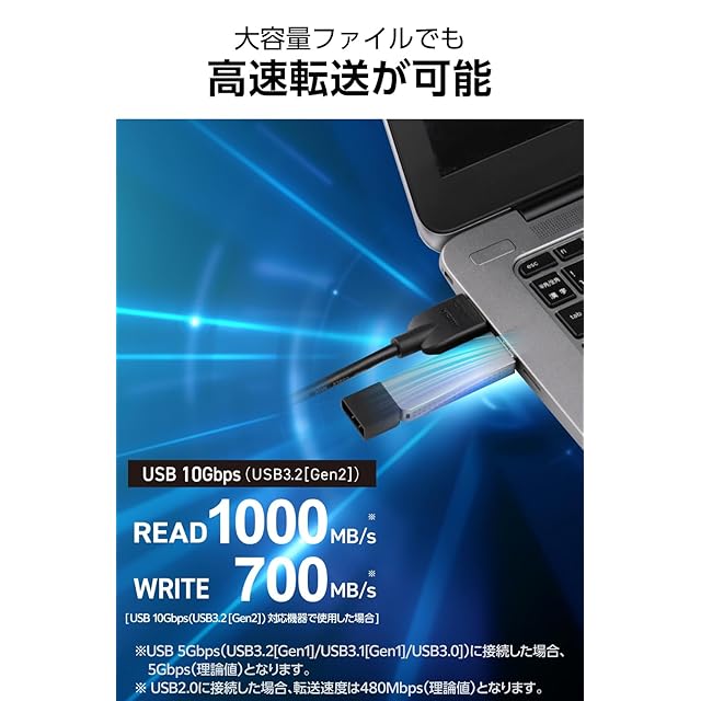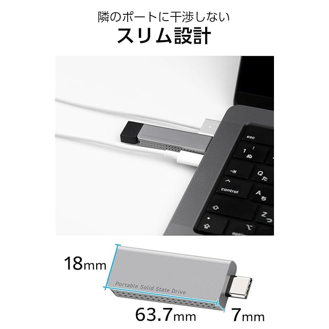 【 仕様 】対応パソコン:USBポートを搭載したWindowsパソコン及びMacシリーズ対応OS(Windows):Windows 11/10 対応OSは、いずれも日本語OSに限りますまた、パソコン本体が対応していないOSでは使用できません対応OS(Mac):macOS Ventura 13, macOS Monterey 12, macOS Big Sur 11 ロジテックツールはWindowsパソコンのみ対応ですインターフェース:USB Type-C(TM) 10Gbps(USB3.2[Gen2, Gen1]/USB3.0/USB2.0)容量:500GBデータ転送速度:読み込み:最大1000MB/s、書き込み:最大700MB/s USB 10Gbps(USB3.2(Gen2))でご使用になるには、機器側がUSB 10Gbps(USB3.2(Gen2))に対応している必要があります出荷時フォーマット:NTFS外形寸法:18×63.7×7mm(本体のみ、突起部を除く)重量:約22g(本体のみ)電源:USBバスパワー期間:1年間