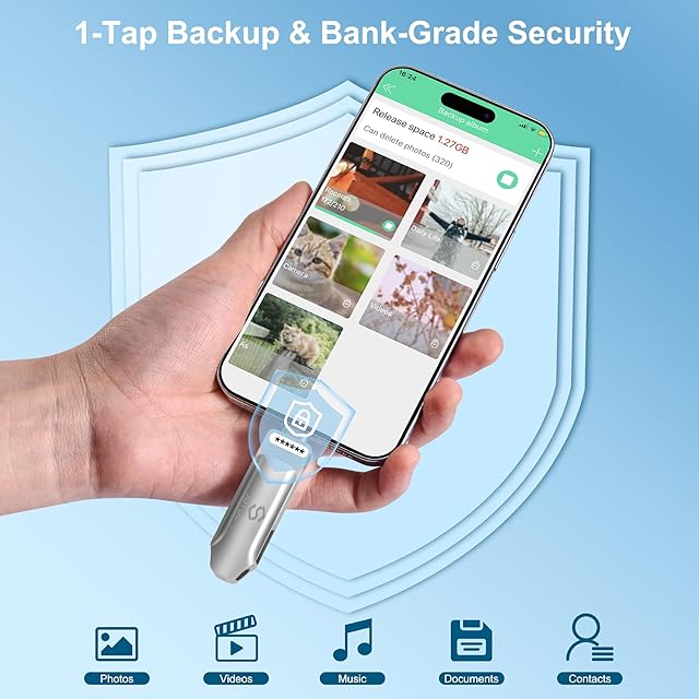 【ワンタッチバックアップ】写真・動画・連絡先をボタンひとつで自動保存。クラウドのような複雑な設定や追加費用は不要で、保存先を手動で選ぶ必要もありません。大切なデータを確実かつ安全に守り、初心者やご年配の方でも迷わず使える安心設計です。iPhone、iPadが、USBメモリ は専用のアプリで動画・写真を撮影します。iPhone/iPad対応:写真・動画を直接USBに保存でき、iPhoneの容量を消費せずに撮影可能。