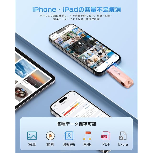 【多機能搭載・iCloud課金対策】本製品はLightning、Type-C、USBコネクタを搭載し、持続的なテストとアップグレードにより、単一端子から複数の端子へのブレークスルーを実現しました。こちらのUSBメモリは、スマホ容量不足解消、データ管理に加え、友人とのデータ共有、ファイルの移動、データ暗号化、連絡先バックアップなどの機能も備えております。パソコンを起動せず、USBケーブルも使用せず、スマホやiPadにUSBメモリを軽く挿入するだけで写真データをUSBメモリに移行し保存できます。⚡iCloudは、無料で利用する場合には5GBの上限があり、iCloud+で容量を増やすには有料です。今は、iCloud の料金を払い続けずに、スマホの容量を減らすことができるようになりました。