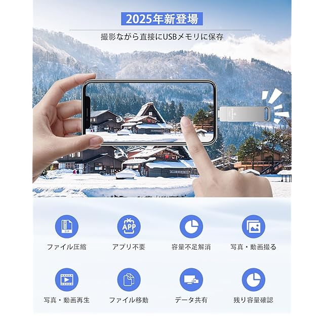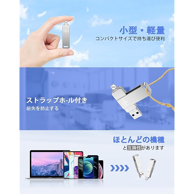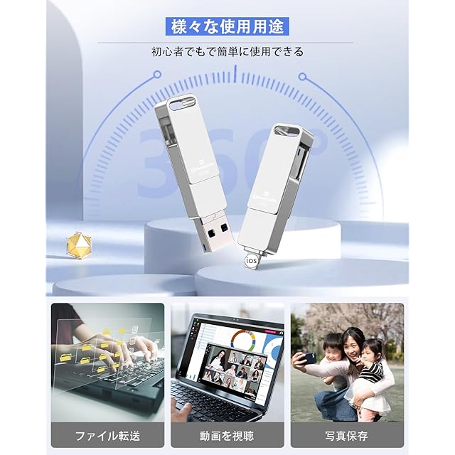 【高耐久性・24ヶ月間品質】アイフォン用 usbメモリ本体は高級感のある亜鉛合金製であるため、耐久性と安定性に優れています。360°回転保護キャップデザインにより、キャップの紛失を防ぎ、90°スタックします。ポイント設計により、ドライブがランダムに回転することを回避します。ハンギングリングを使用して、サムドライブUSBCをキーチェーンに掛けることができます。こちらの24ヶ月間の品質と購入後の3ヶ月内で初期不良の交換サービスを行っております。ご安心してご購入頂けます。
