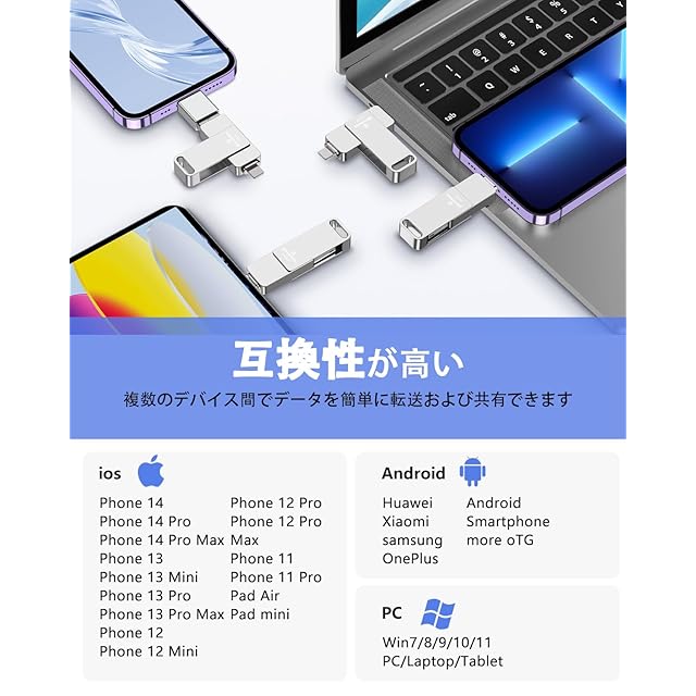 【多機種対応・互換性が抜群】アイフォンバックアップはすべてのiOSシリーズと互換性があります。USB-Cコネクタを搭載したMacbook、Androidとも互換性があります。iPhone 15/14 /14 Pro/13 Pro Max/13 mini/ 12 /12 Pro/12 Pro Max/12 mini/ 11 /11 Pro/11 Pro Max / SE/X /XS/XS Max /XR/8 Plus/8 / 7 Plus/7 /6s Plus/6s/6 6 Plus /iPad Air iPad(第9/8/7/6/5世代)Pad mini(第6/5/4/3世代)/ MacBook Air/Macbook Pro/ Mac/PC /ノートパソコン/Androidスマホ(OTG機能付き)などのデバイスに対応します。