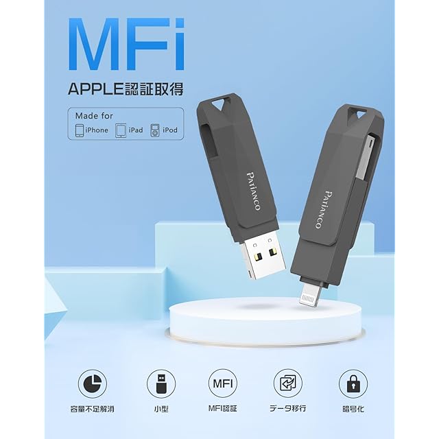【MFi認証取得】弊社のUSBメモリーはMFi認証品であり、iPhone/iPad/iPod/との互換性をすることを示すものです。MFi認証のある製品はApple社に認定されていると同義であり、互換性も保障されていて、安全に利用できることを証明しています。ご購入の際は、MFi認証のあるiPhone用USBメモリをご確認ください。