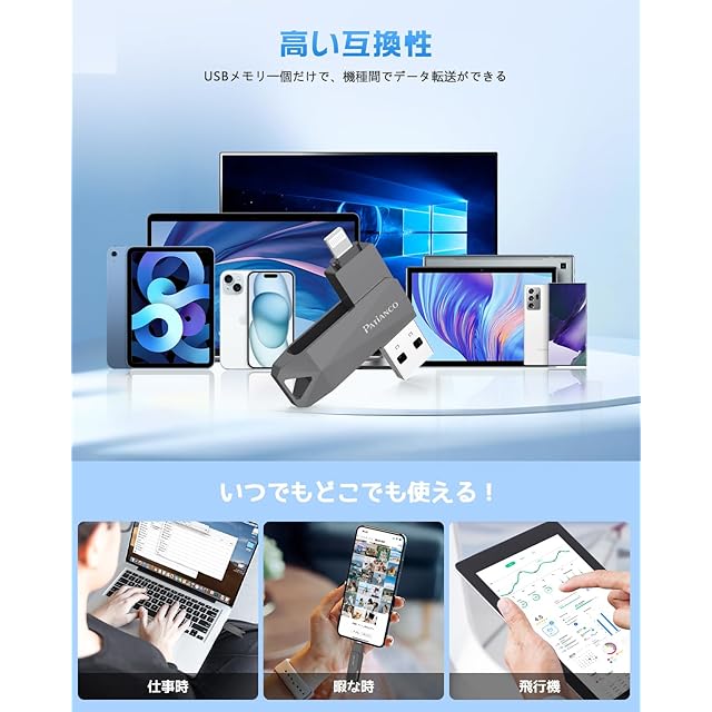 【高い互換性】弊社のUSBメモリはすべてのiOS機種に対応し、タイプCアダプターも付属しておるので、Type-CコネクタのiPhone、iPad、Type-C機種とも互換性があります。対応機種:iPhone 15 Pro Max/15 Pro/15 Plus/15/iPhone 14 Pro Max/14 Pro/14 Plus/14/SE 3/13 Pro Max/13 Pro /13/13 mini /12 Pro Max/12 Pro/12 /SE 2 /11 Pro Max/11 Pro/11 /XR/XS Max/XS /X /8 Plus/8/7 Plus/7/SE 1/6s Plus /6s/6 Plus/6/ iPad Pro(第1/2/3/4/5/6世代)/ iPad Air(第1/2/3/4/5世代)/ MacBook(Pro/Air)/ iPad mini(第1/2/3/4/5世代)/ iPad(第5/6/7/8/9/10世代)/ PC /ノートパソコン/ Type-C機種などと互換性があります。