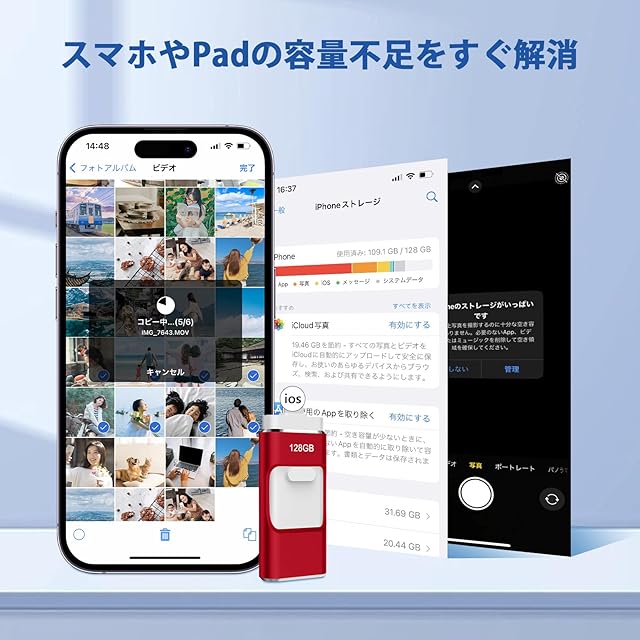 【高速でデータ転送・12ヶ月間】USB2.0により、USB3.0のUSBメモリーはより高速で、データが多くても、より短い時間で転送できます。高速的なテクノロジー時代に欠かせないiPhone対応USBメモリーです。USBメモリーの読み込み速度は30-80MB/sに達することができ、書き込み速度は10-30MB/sに達することができます。(実際の速度はハードディスクの読み込み速度、書き込み速度と関係があります)。こちらのiPhone対応USBメモリ128GBは1年間の品質と購入後の3ヶ月内で初期不良の交換サービスを行っておりますので、安心してご購入頂けます。初期不良および使用中の故障がございましたら、各種対応をさせて頂きますのでご安心ください。