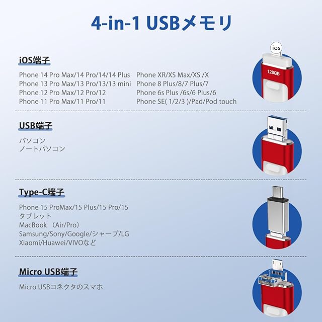 【専用アプリ不要】4in1 Phone対応 USBメモリ128GB 高速 データ バックアップphone写真データ保存iOS/USB/Type-C/Micro USB搭載 大容量 フラッシュメモリ タイプc USBメモリiphone用外付けメモリPhone/Pad/PC/Macbook/Android対応携帯容量不足解消 赤