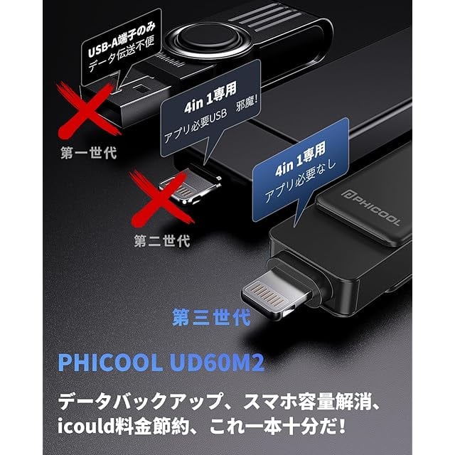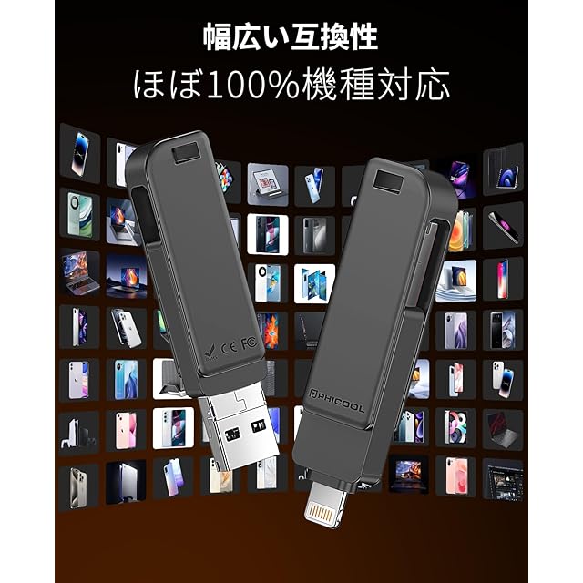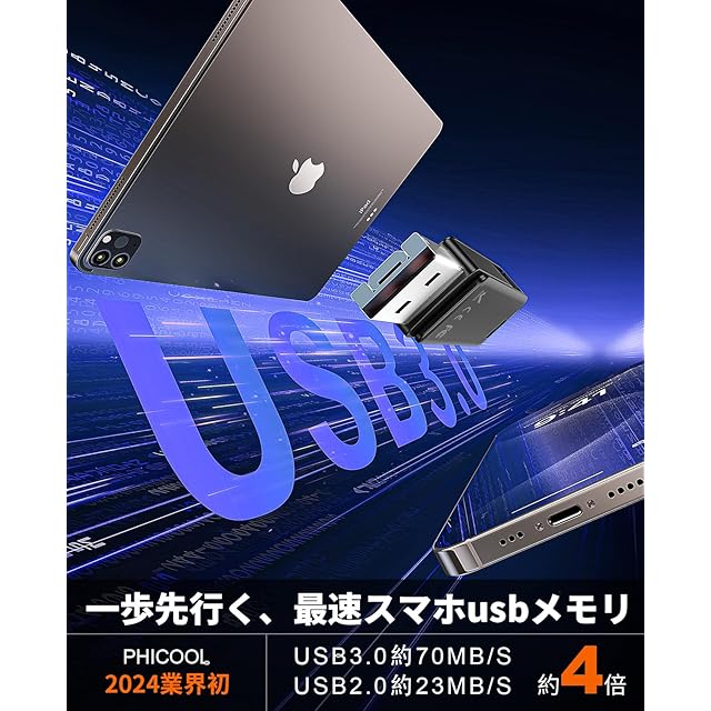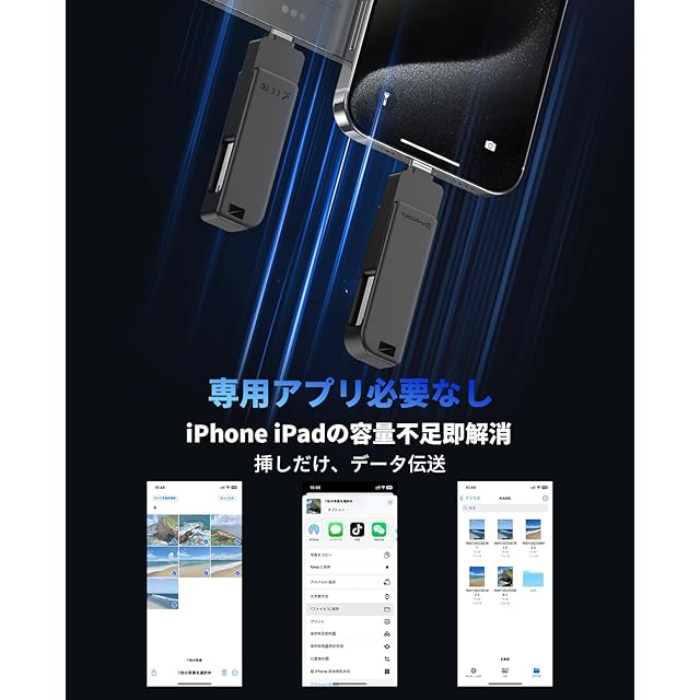 「日本限定・専用アプリが必要なし、挿しだけ使えるusb メモリ」当社のPhone usbメモリは専用アプリのインストールが必要なし、デフォルトの「ファイル」アプリを利用して、挿しだけを使用できます。さらに、USB-A、IOS、MicroUSB、Type-Cが付きので、様々な端末に対応できて、写真・動画・会議の資料を出先でWiFiがない時でもスマホで手軽に見られるので便利です。データ管理がこれ一本!