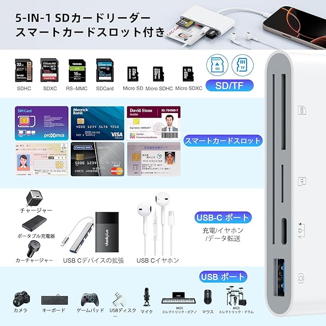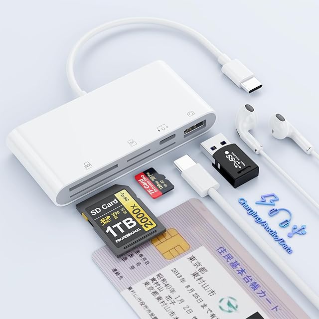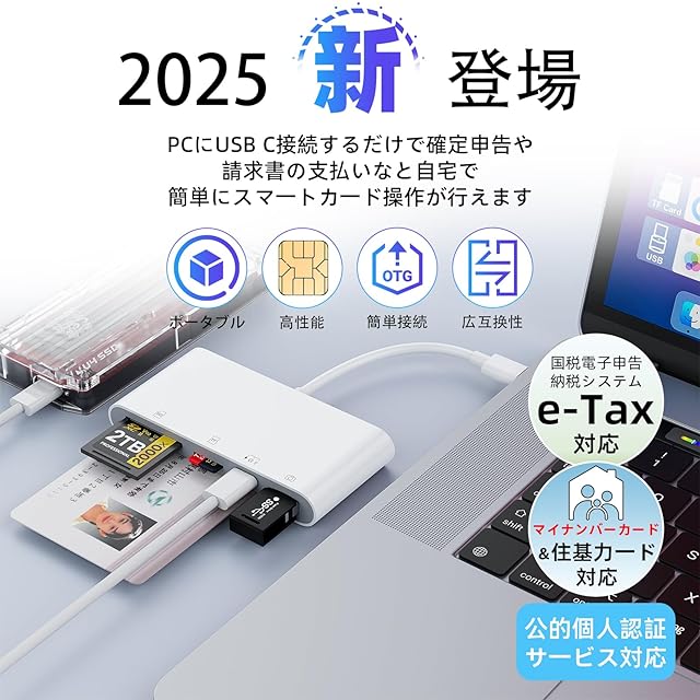 【2025最新型】5in1 icカードリーダー マイナンバーカード対応 タイプc SDカードリーダー 【SD/SDHC/SDXC/RS-MMCカード/IC カード/usbメモリ/イヤホン用】 設置不要 双方向データ転送 自宅で確定申告 国税電子申告 納税システム e-Tax対応 iPhone16 15/iPad/MacBook/Chromebook/AndroidスマホなどUSB-C機器対応