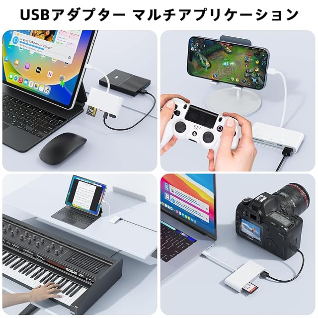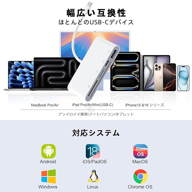 【マルチデバイス対応】Windows、Mac OS、Linux、AndroidなどType-Cポート搭載した全てのデバイスに対応。iPhone15/iPad Pro/MacBook Pro Air/MacBook/iMac Pro/Mac mini/Dell/HP/Surface Book/Xperia/Google Pixelなどに対応。タブレットからusbアダプタまで標準の写真フォーマットやJPER、RAW、SD、hdビデオフォーマットに対応しています。カメラ、マウス、キーボード、USBメモリ、カードリーダーなど、USB周辺機器を接続することもできます。
