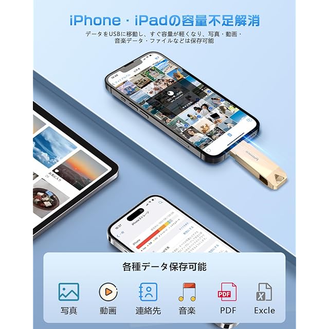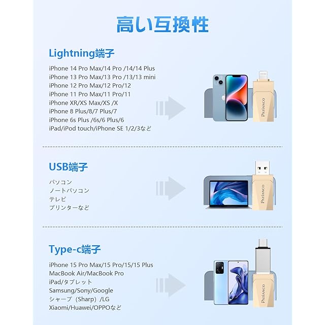 【高い互換性】弊社のUSBメモリはすべてのiOS機種に対応し、タイプCアダプターも付属しておるので、Type-CコネクタのiPhone、iPad、Type-C機種とも互換性があります。対応機種:iPhone 15 Pro Max/15 Pro/15 Plus/15/iPhone 14 Pro Max/14 Pro/14 Plus/14/SE 3/13 Pro Max/13 Pro /13/13 mini /12 Pro Max/12 Pro/12 /SE 2 /11 Pro Max/11 Pro/11 /XR/XS Max/XS /X /8 Plus/8/7 Plus/7/SE 1/6s Plus /6s/6 Plus/6/ iPad Pro(第1/2/3/4/5/6世代)/ iPad Air(第1/2/3/4/5世代)/ MacBook(Pro/Air)/ iPad mini(第1/2/3/4/5世代)/ iPad(第5/6/7/8/9/10世代)/ PC /ノートパソコン/ Type-C機種などと互換性があります。