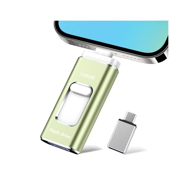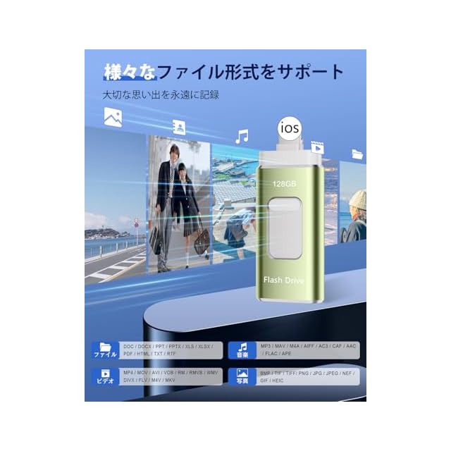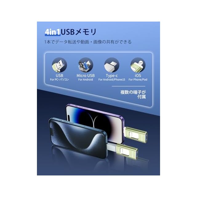 128GB USBメモリー【アプリ不要】4in1 phone対応usbメモリ高速USB 3.0 IOS/USB/Type-C/micro usb フラッシュメモリ type-c USB メモリーphoneデータ 転送保存 写真 バックアップアイフォン用 外付けメモリIOS/Android/Win/MAC対応 携帯容量不足解消(ライトグリーン)