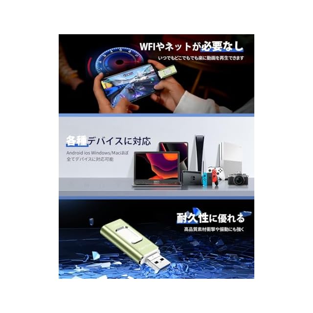 【高い互換性】本iPhone対応USBメモリーはすべてのPhone、iPadシリーズに対応いたします。Type-Cアダプターも付属しておりますので、Type-CコネクタのiPad、Phone、MacBookとも互換性があります。Phone16/ 15 Pro Max/15 Pro/15 Plus/15/14 Pro Max/14 Pro/14 Plus/14/SE 3/13 Pro Max/13 Pro /13/13 mini /12 Pro Max/12 Pro/12 /SE 2 /11 Pro Max/11 Pro/11 /XR/XS Max/XS /X /8 Plus/8/7 Plus/7/SE 1/6s Plus /6s/6 Plus/6/ iPad Pro(第1/2/3/4/5/6世代)/ iPad Air(第1/2/3/4/5世代)/ MacBook(Pro/Air)/ iPad mini(第1/2/3/4/5世代)/ iPad(第5/6/7/8/9/10世代)/ PC /ノートパソコン/ Type-Cスマホ/ タブレットなどと互換性があります。