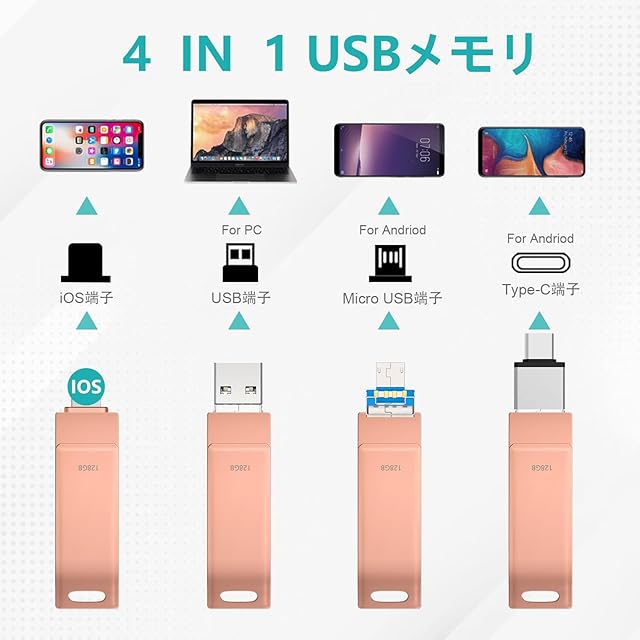 128GB Phone対応usbメモリ【専用アプリのパフォーマンスがより安定】 写真保存 直接usbに写真を移す4in1 フラッシュドラメモリAndroid パソコン対応 USBメモリ phoneの写真 を パソコン に 取り込む 容量不足解消