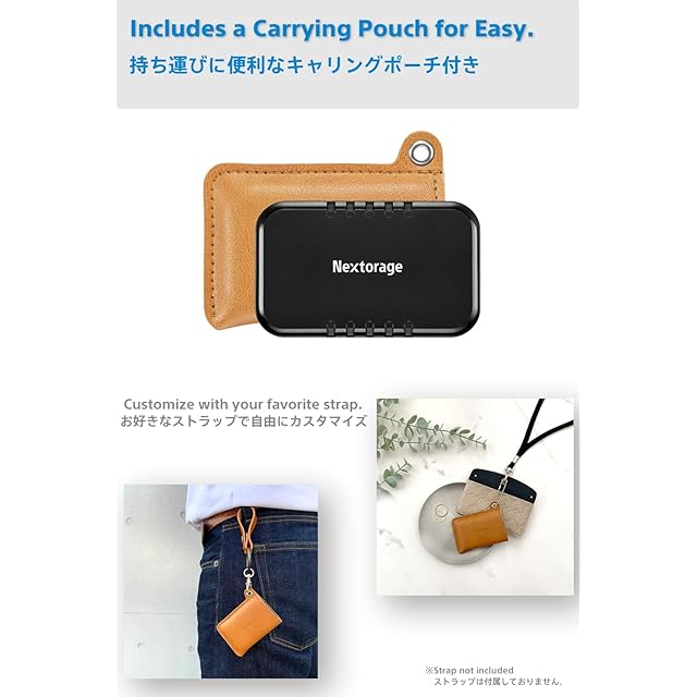 超小型で軽量ながら高速転送を実現: 約66 mm×40 mm×9 mm(最大突起物を除く)、本体 約 19 g、キャリングポーチ 約 5 g