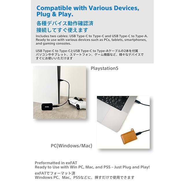 汎用外部記憶装置として幅広いOS,機器に対応 各種OS(Windows10以降、Mac OS 11以降、iPad , Andoroidなど)と機器 (iphone , Playstation 4 , playstation 5 など)※詳細はNextorageホームページをご確認ください。