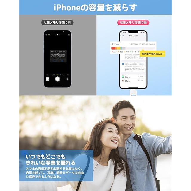 【容量不足解消・日本語取扱説明書付】スマホやPadなどに保存される写真や動画が増えているため、容量はいっぱいになって、iCloudストレージも上限に達し、スマホはフリーズしやすくなって、今は256GBのiPhone対応USBメモリーを使用すると、スマホの写真、動画などのデータを削除せずにUSBメモリに移行できて、スマホの容量を軽くすることができます。本製品には日本語取扱説明書が付属しており、USBメモリ中にも日本語取扱説明書のPDFファイルがあるので、シンプルで操作が分かりやすいです。