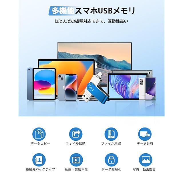 【4in1多機能・セキュリティ機能付】USBメモリはライトニング、Type-C(USB-C)、USB(USB-A)、Micro USBの4つのコネクタを搭載し、iOS機種、パソコン、Type-Cスマホ、Macbookなどに対応します。iPhone対応USBメモリを一個使用するだけで、異なる機種の間でデータ移行・保存ができます。USBメモリは、データバックアップ、ファイル移動、データ管理、データ共有、ファイル圧縮、データ暗号化、連絡先バックアップや写真・動画撮るなどの機能で構成され、普通のUSBメモリと比べて、著しい進歩を遂げています。USBメモリ内のデータはパスワードかけれるので、データ漏洩を効果的に防止できます。(ご注意:スマホとパソコンのシステムが異なるため、暗号化されたデータはパソコン上で見ることができなく、セキュリティ機能はiOS機種でしか使用できず、他の機種ではサポートされていませんので、予めご了承ください。)