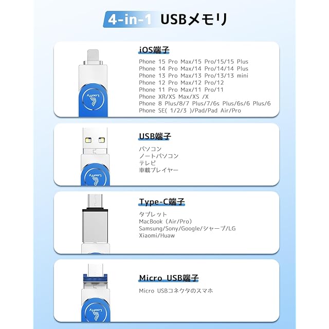 【2024年登場】4in1 iPhone対応 USBメモリ 256GB iPad対応 usbメモリー 高速 データバックアップ スマホ 容量不足解消 iOS/USB/Type-C/Micro USB搭載 回転式 Phone/PC/Android/Mac/iPad対応 外付けusb 写真・動画・ファイル保存 Phone 15/14/13/12/SE/Pad Air/Type-C機種対応 ブルー