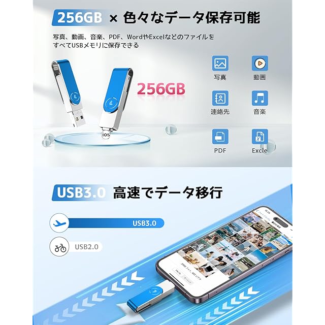 【データ移行・256GB大容量・USB3.0】USBメモリを使用することで、スマホに保存される写真や動画をUSBメモリにバックアップできて、スマホの空き容量を増やすだけでなく、スマホの動作をサクサクにします。写真や動画などのデータをUSBケーブルでパソコンに移行する必要もなくなり、今ではスマホにUSBメモリを挿入するだけで、動画、写真、音楽、PDFファイルや書籍資料などのデータをすべてUSBメモリに移行できます。256GBは1枚2MBの写真なら、約120,000枚も保存でき、日常的に使うなら256GBの容量は十分です。USB3.0はUSB2.0により速度は早いです。データを大量にコピーしても高速で、データ移行の時間を大幅に短縮し、データ時代に欠かせないiPhone対応usb メモリーです。USBメモリーの読み込み速度はに30-80MB/sに達することができ、書き込み速度は10-30MB/sに達することができます。