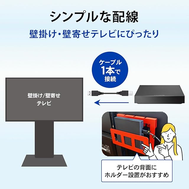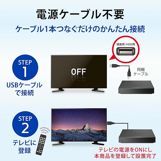【ケーブル1本つなぐだけ!「トロッカ」でテレビ録画をはじめよう】テレビとの接続はとても簡単!パッケージに同梱しているUSBケーブルを使って、テレビと本商品をつなぐだけ。そのほかの面倒な配線は一切不要です。つないだら、操作画面に従って本商品をテレビに登録すれば設定が完了します。