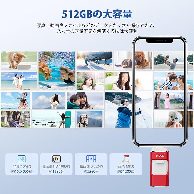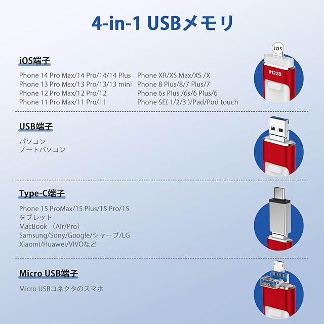 【専用アプリ不要】4in1 Phone対応 USBメモリ512GB 高速 データ バックアップphone写真データ保存iOS/USB/Type-C/Micro USB搭載 大容量 フラッシュメモリ タイプc USBメモリiphone用外付けメモリPhone/Pad/PC/Macbook/Android対応携帯容量不足解消 赤