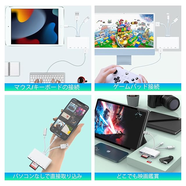 ✅【5-in-1カードリーダー】2*USB ポート + 1*SDポート(SD /SDHC/SDXC/MMC/RS-MMC)+1*TFポート(Micro SD/Micro SDHC/Micro SDXC)1*Lightningポートが装備されています。iPhone カードリーダーを使えば、いつでもどこでもビデオや写真を共有することができ、携帯電話の容量不足や写真の多さ、外部デバイスや充電の心配もない。