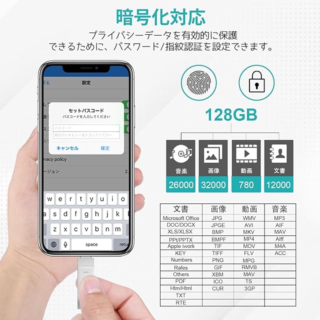 【多機種対応】 USBメモリ にはiOS、USB、type-c、micro USBの機種の接続タイプが4種も使用出来るので、PC/Android/MacBook/iOSで簡単にデータ バックアップです。 usbメモリはPhone 16 Pro Max/16 Pro/15 Plus/15/14 Pro Max/14 Pro/14 Plus/14/SE 3/13 Pro Max/13 Pro /13/13 mini /12 Pro Max/12 Pro/12 /SE 2 /11 Pro Max/11 Pro/11 /XR/XS Max/XS /X /8 Plus/8/i Pad Air(第1/2/3世代)/ MacBook(Pro/Air)/iPad mini(第1/2/3/4/5世代)/i Pad(第5/6/7/8/9世代)全シリーズ/ パソコン/ Type-Cスマホ/ Androidスマホ /タブレットなどとデータ移行 互換性のあるusbメモリ。