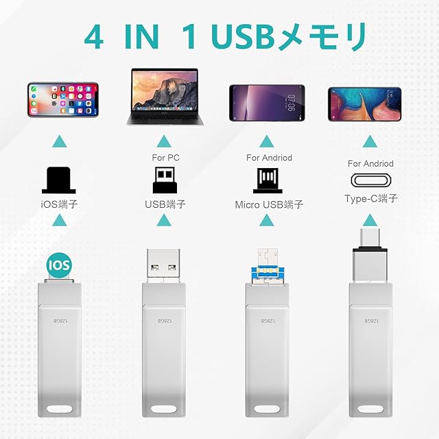 128GB Phone対応usbメモリ【専用アプリのパフォーマンスがより安定】 写真保存 直接usbに写真を移す4in1 フラッシュドラメモリAndroid パソコン対応 USBメモリ phoneの写真 を パソコン に 取り込む 容量不足解消