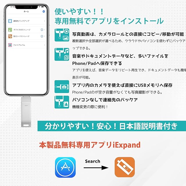【品質3年・専門スタッフによる日本語対応】 phone 外 付け usb は十数通りの検査手順で逸品を確保,usbメモリはセイコー級 構造最適化で長持ち。人気のusb phoneランキングは1年間の品質購入後1ヶ月以内に、故障したUSBの交換に対応します。日本語取扱説明書と迅速対応のサポートサービスがあります。日本国内でのカスタマーサービスによって、スムーズな問題解決ができるようになっております。説明書内に連絡先を記載しておりますので、どうぞご連絡ください。