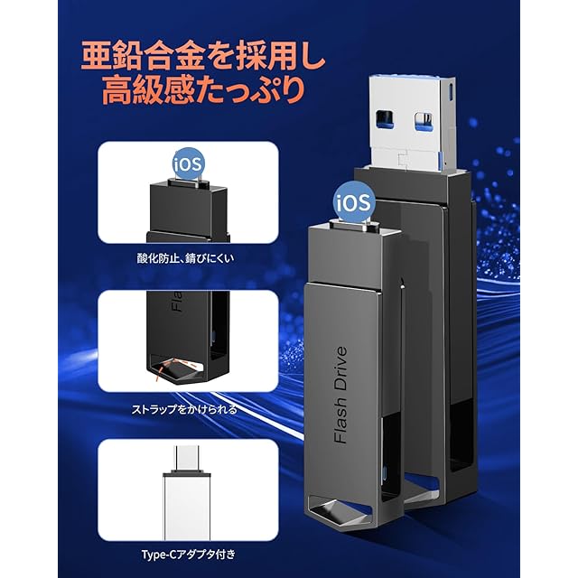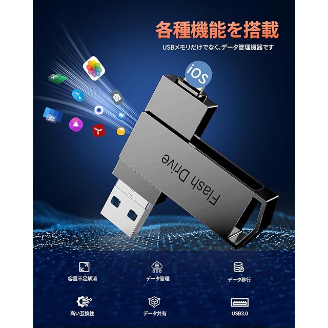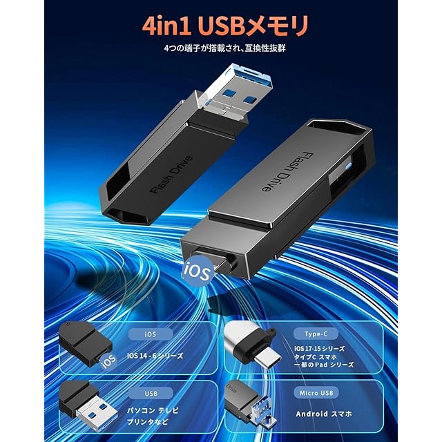 【4in1USBメモリ・互換性抜群】本USBフラッシュメモリは、iOS、タイプc、USB、Micro USB ポートを搭載しており、iOS、Android、Windows、およびOSシステムと互換性があります。1つのUSBメモリで各デバイス間でデータを共有し、バックアップすることができます。詳細機種:Phone 17ProMax/17Pro/17Air/17/16ProMax/16Pro/16Plus/16/16/ProMax/15Pro/15Plus/15/14ProMax/14Pro/14Plus/14/SE3/13ProMax/13Pro/13/13mini/12ProMax/12Pro/12/SE2/11ProMax/11Pro/11/XR/XSMax/XS/X/8Plus/8/7Plus/7/SE1/6sPlus/6s/6Plus/6/Pad Pro(第1/2/3/4/5/6世代)/Pad Air(第1/2/3/4/5/6/7世代)/Pad mini(第1/2/3/4/5/6/7世代)/Pad(第5/6/7/8/9/10/11世代)/タイプcスマホ/PC/タブレットなど。