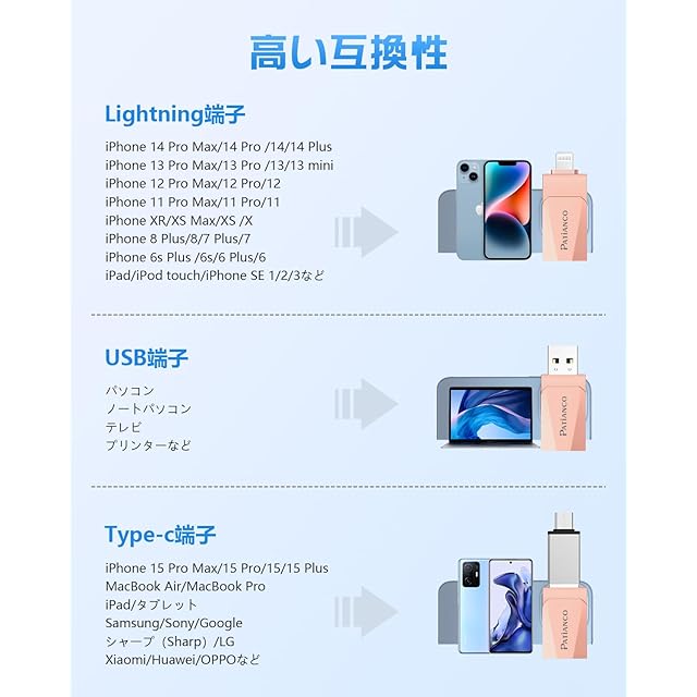 【高い互換性】弊社のUSBメモリはすべてのiOS機種に対応し、タイプCアダプターも付属しておるので、Type-CコネクタのiPhone、iPad、Type-C機種とも互換性があります。対応機種:iPhone 15 Pro Max/15 Pro/15 Plus/15/iPhone 14 Pro Max/14 Pro/14 Plus/14/SE 3/13 Pro Max/13 Pro /13/13 mini /12 Pro Max/12 Pro/12 /SE 2 /11 Pro Max/11 Pro/11 /XR/XS Max/XS /X /8 Plus/8/7 Plus/7/SE 1/6s Plus /6s/6 Plus/6/ iPad Pro(第1/2/3/4/5/6世代)/ iPad Air(第1/2/3/4/5世代)/ MacBook(Pro/Air)/ iPad mini(第1/2/3/4/5世代)/ iPad(第5/6/7/8/9/10世代)/ PC /ノートパソコン/ Type-C機種などと互換性があります。