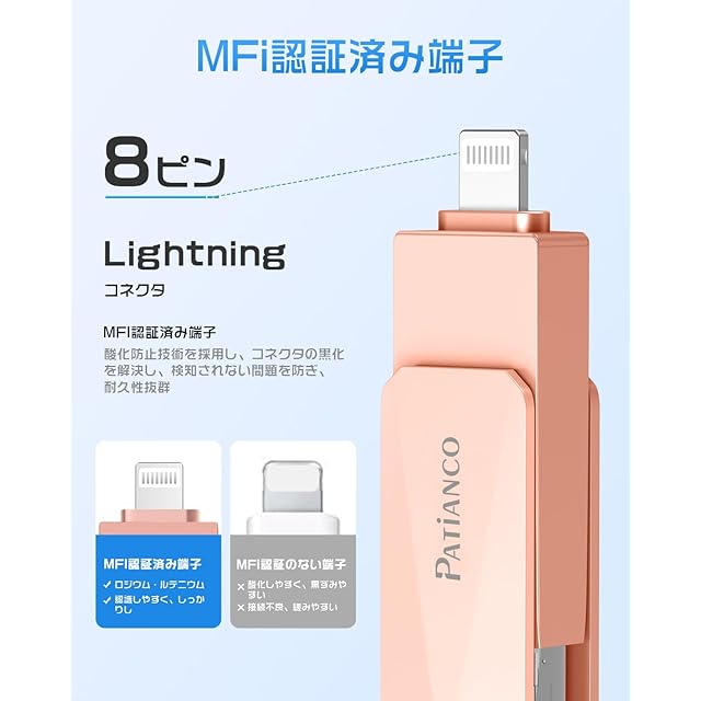 【MFi認証取得】弊社のUSBメモリーはMFi認証品であり、iPhone/iPad/iPod/との互換性をすることを示すものです。MFi認証のある製品はApple社に認定されていると同義であり、互換性も保障されていて、安全に利用できることを証明しています。ご購入の際は、MFi認証のあるiPhone用USBメモリをご確認ください。