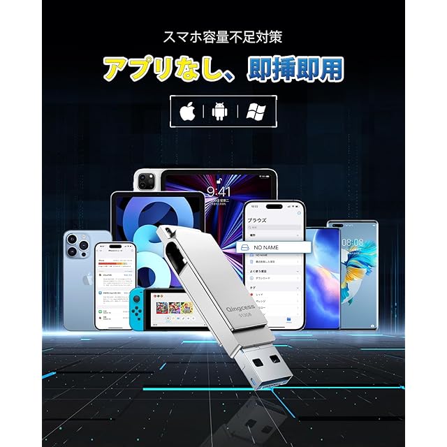 「アプリ不要・即挿即用usbメモリ」このような悩みを持っていますか?iPhoneの写真が多すぎて容量不足になっていませんか?整理ができず、スマホ用のUSBメモリを購入したものの、様々なアプリをダウンロードしなければならず、アプリの安全性に不安を感じていませんか?Q ingcess社は、長年の調査を経て、お客様の声に基づいて、アプリ不要で挿すだけで使えるスマホ用USBメモリを開発しました。わずか3ステップでiphoneデータの転送と保存が簡単に完了します。機械音痴でも、簡単に操作可能iphone usbメモリ。
