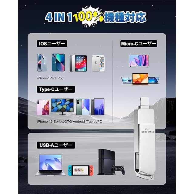 「100%機種対応、様々なシーシン適用なusbメモリ」当社のUSBメモリは、USB-A、iOS、Type-C、Micro USBの4つのポートを備えています。iOSデバイス、Androidデバイス、Windows、Mac、PS4、PS5など、最新のiPhone 15を含む様々なデバイスに対応しています。iPhoneの写真バックアップ、iPhonデータの保存や転送、iphone ストレージの拡張、テレビでの写真閲覧、PCデータ転送、学習資料や仕事資料の保存、ゲームの録画など、あらゆる用途に安心してご利用いただけます。データの保存と整理は、この1本で十分です。