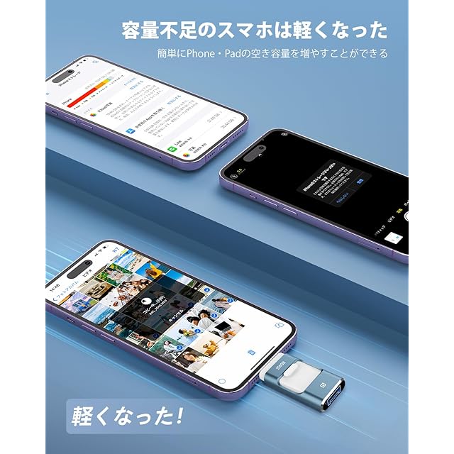 【アプリ不要、全面的にアップグレード!】専用アプリをダウンロードしないと使えない?最新技術でアップグレードされた新登場のiPhone対応USBメモリは、専用アプリをダウンロードせずにデータを移行できて、専用アプリから解放します。USBメモリーをスマホに挿入するだけで、写真や動画などのデータをスマホのアルバムからUSBメモリに保存できて、スマホに付属している「ファイル」アプリではUSBメモリーに保存されているデータを確認できます。